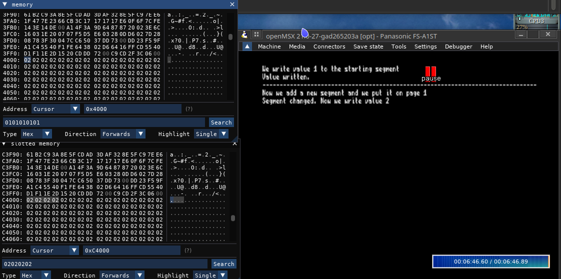 En aquest punt, si anem al menú Debugger de l'openMSX i escollim l'opció Add hex editor i després slotted memory veurem tota la memòria de l'ordinador i si naveguem amunt i avall, ens serà fàcil veure els blocs amb els números 1, 2 ó 3. En el meu cas aquests començaven a 0x8000, 0x14000 and 0xC4000.